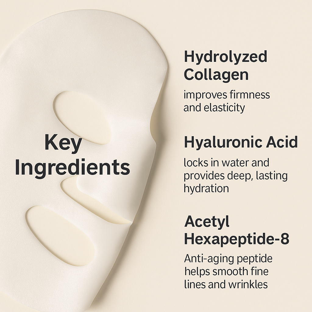 - Hydrolyzed Collagen → improves firmness and elasticity, visibly plumps the skin.